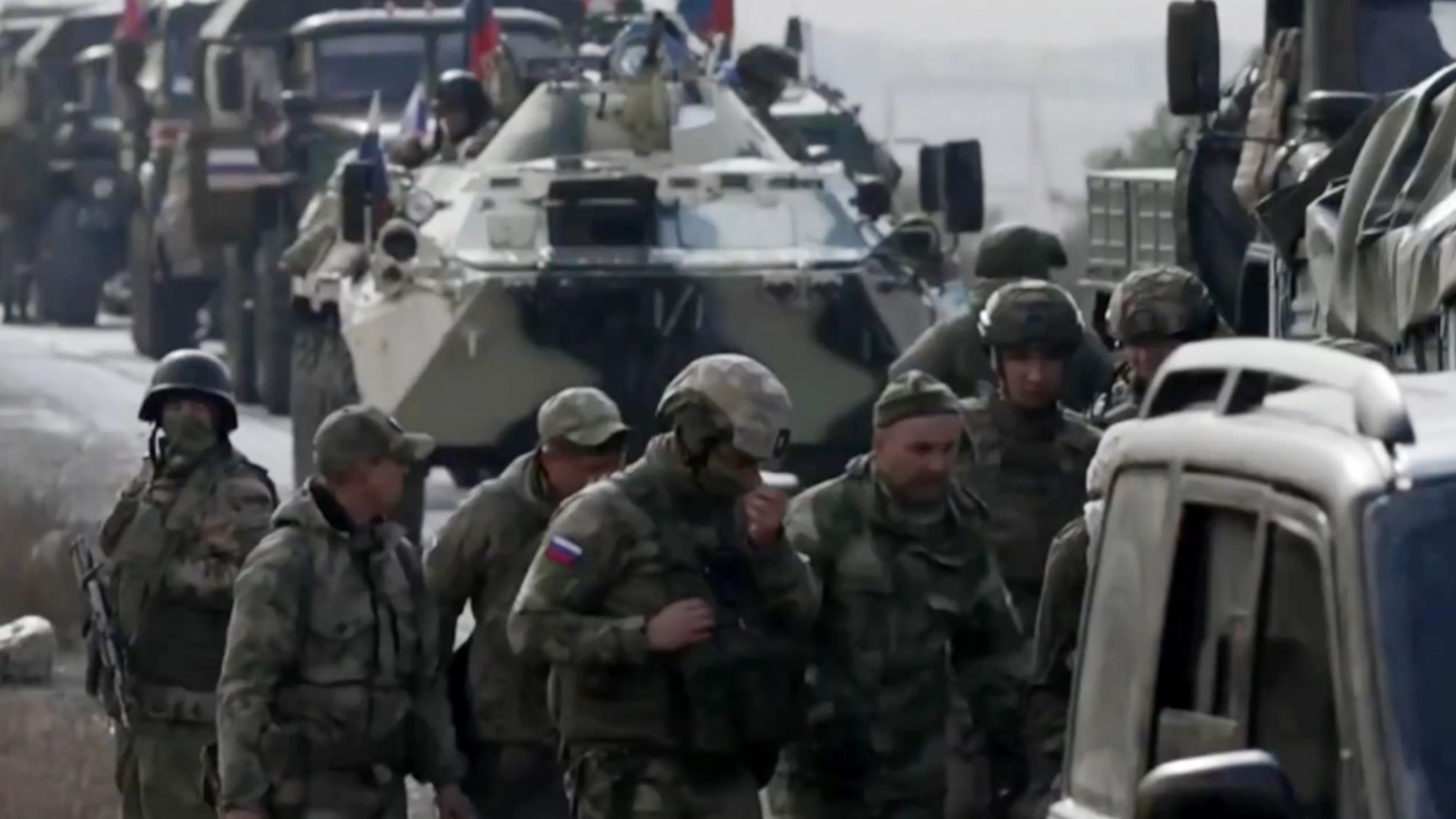 Dešimtys karių buvo įsprausti į armijos sunkvežimius, plaukiojančius su Rusijos vėliava.