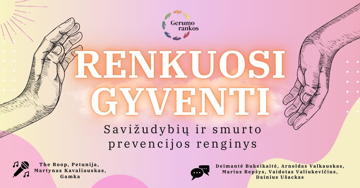 Lapkričio 3 d. popietę Kauno kultūros centre (Vytauto pr. 79) įvyks tradicinis, jau šeštus metus iš eilės organizuojamas, VšĮ „Gerumo rankos“ renginys „Renkuosi gyventi“. Iniciatyva skirta savižudybių ir smurto prevencijai. Ja norima pasiekti kiekvieną, kuriam šiuo metu sunku, ir priminti, kad pagalba visada egzistuoja. Dalyvių lauks įkvepiantys pokalbiai, pažintis su įvairiomis organizacijų veiklomis ir teikiama pagalba bei muzikinė programa.