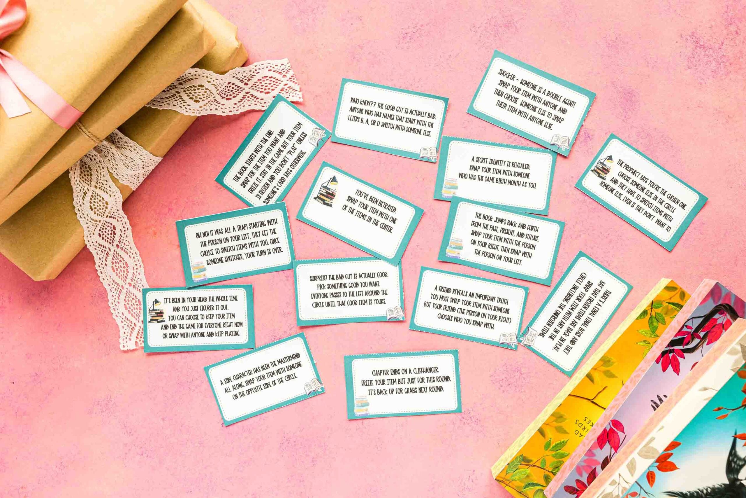 Šis siužetinis knygų mainų žaidimas yra vienas smagiausių būdų keistis knygomis su draugais! Žaiskite knygų klube, mergaičių vakare ar net knygyne, kur norite pasikeisti naudotomis knygomis!